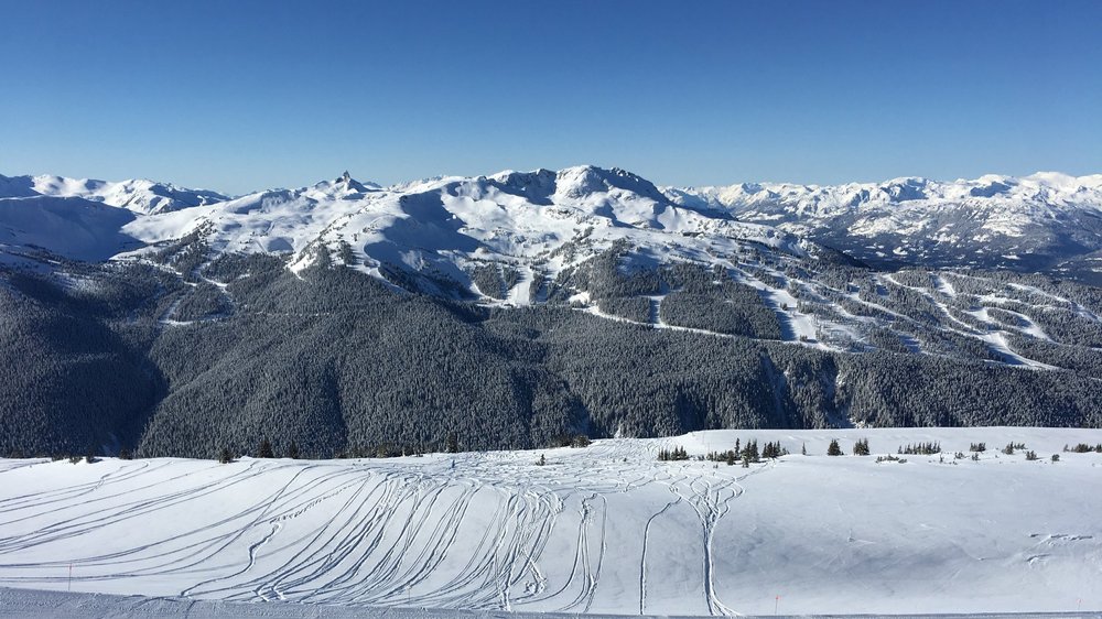 The views at Whistler Blackcomb are nothing short of spectacular, with many jagged peaks in the Coast Range plainly visible, and some upper parts of one peak giving you a nearly complete view of the other and its associated slopes.