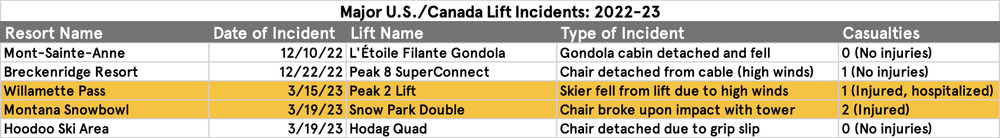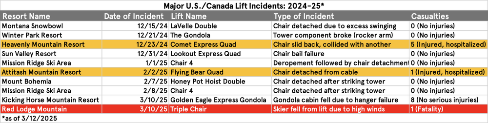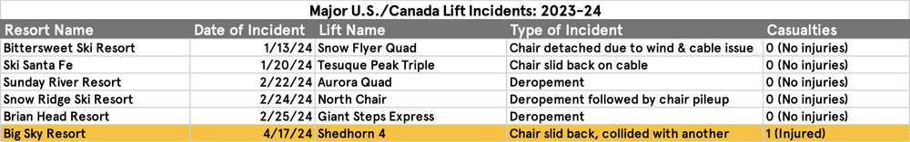 To play devil’s advocate, lift failures happen nearly every season, and many of the incidents in 2022-23 and 2023-24 occurred at smaller, locally-oriented resorts that received less national attention. This could mean that the increase in awareness this year is partially due to greater media coverage rather than a surge in actual failures.