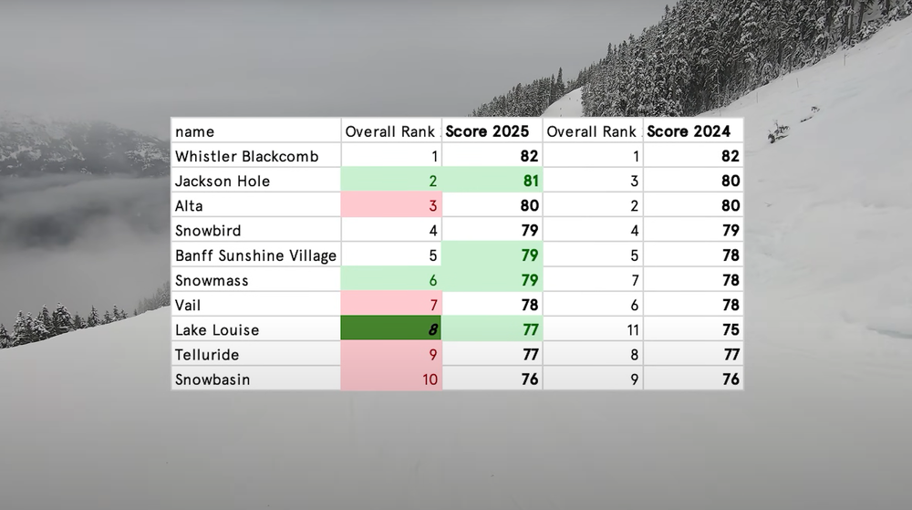 Our updated list of the Top 10 ski areas in North America includes the addition of Lake Louise, while Jackson Hole and Snowmass have climbed the ranks as well. The 2024 rankings are provided on the right-hand side for reference.