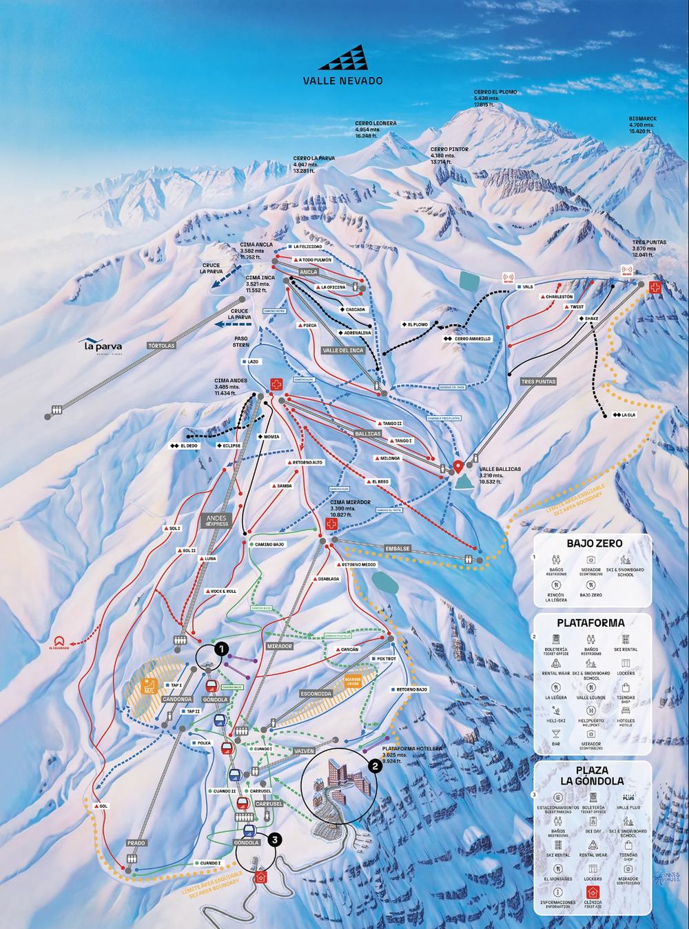 It’s also worth noting that Valle Nevado is one of three interconnected ski resorts that make up Chile’s Tres Valles region, alongside La Parva and El Colorado. In fact, parts of El Colorado’s back side are clearly visible from the Valle Nevado base area, and it’s not uncommon for guests to mistake that terrain as part of Valle Nevado proper until they take a closer look at the trail map and boundary markings. While these three ski resorts have historically been independently operated, they are physically connected by skiable terrain under the right conditions, and as a result, it’s possible to ski or ride between them.